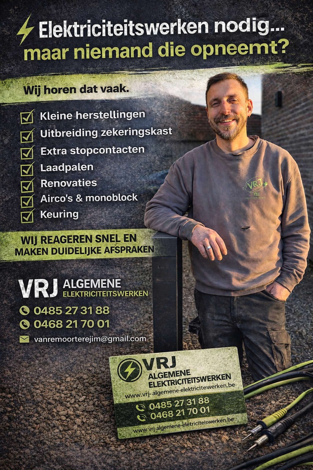 Of het nu gaat om stroompannes, elektriciteit leggen in nieuwbouw, oude elektrische leidingen vervangen, elektrische installaties uitbreiden, het opmaken van ééndraadschema en/of situatieplannen, plaatsten van airco's, laadpalen, conform maken van u woning.....voor andere elektrische problemen groot of klein, ben je bij VRJ aan het juiste adres!!!